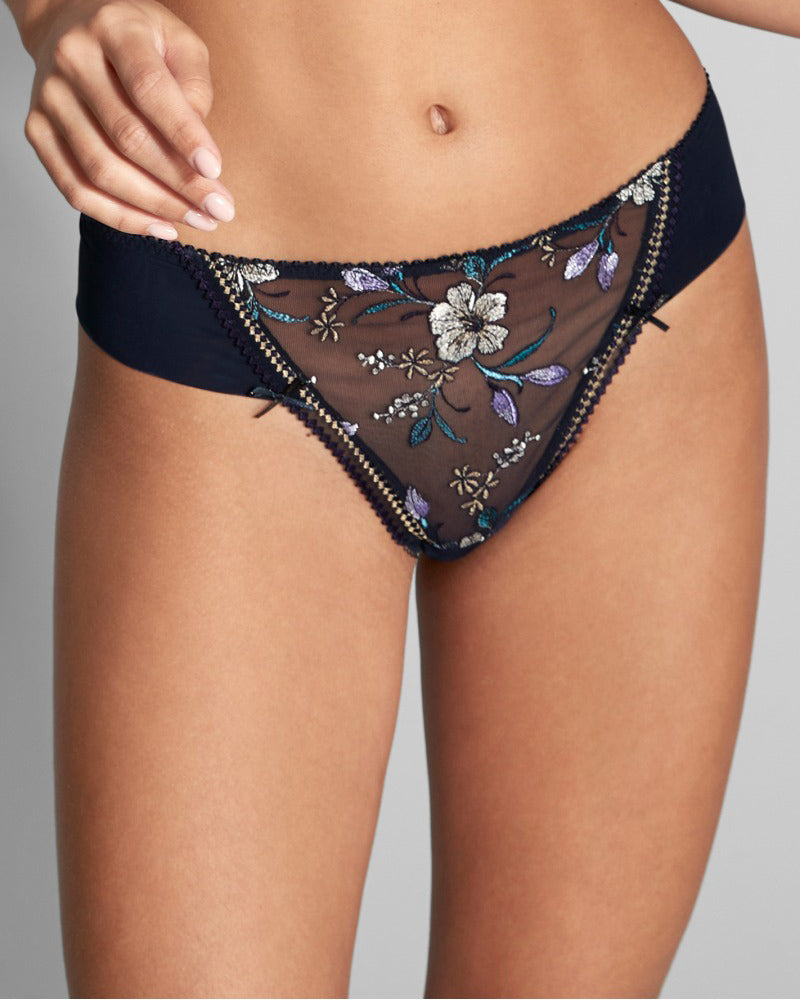 The Empreinte Lauren String Thong is the ultimate sexy knicker style. The embroidered flowers on the front shimmer and perfectly complement the geometric pattern, slimming curves. The little satin bows here and there give a decorative touch to this very sexy shape. The pattern is enhanced with a delicate palette of natural shades in this beige, old-style gold colourway.