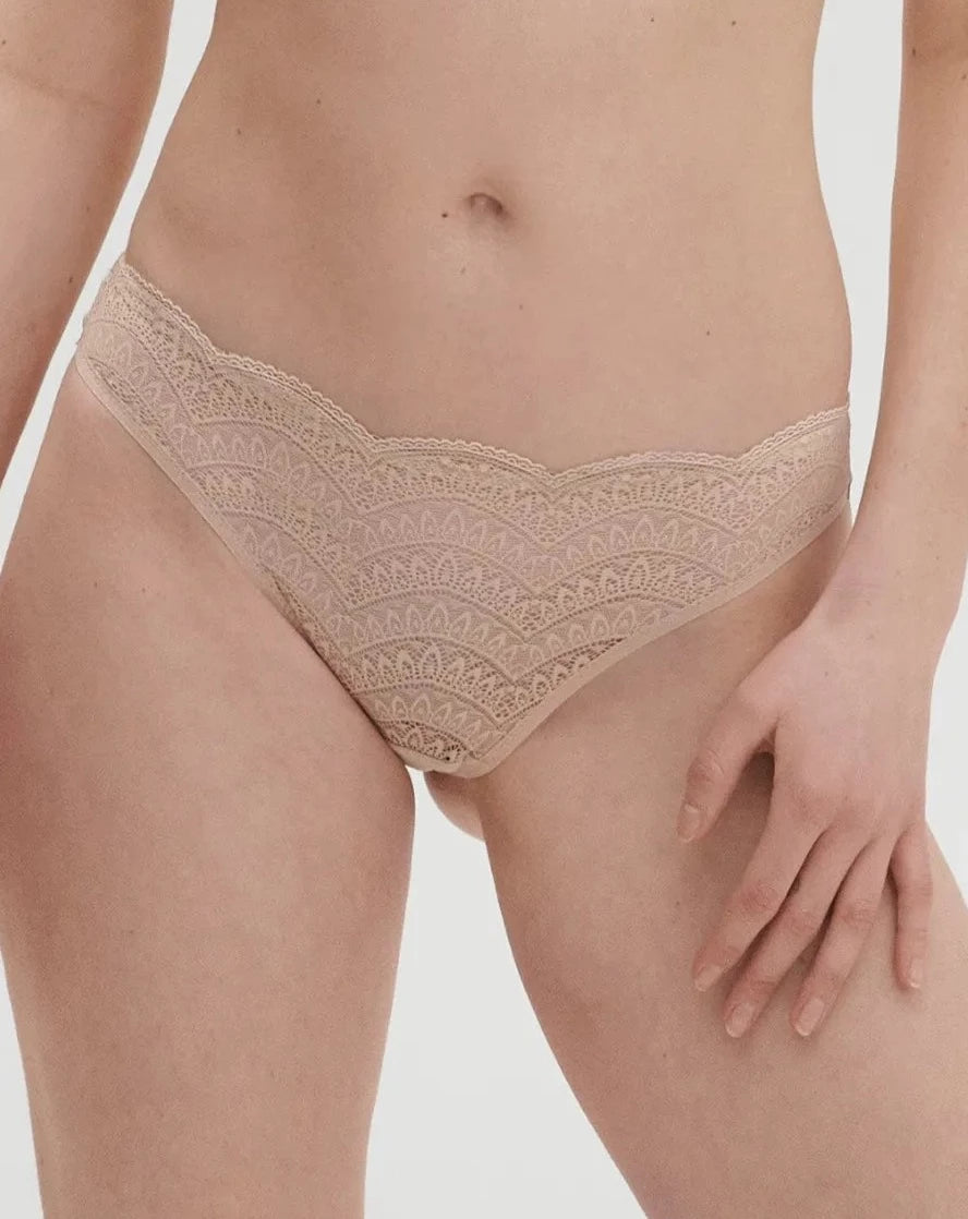 The Simone Perele Karma Brief has romantic scalloped lace in the front, seamless and soft stretch microfiber in the back. Who says you can't have the best of style and comfort? The Karma Bikini is already ready for the matching set, and so are you.